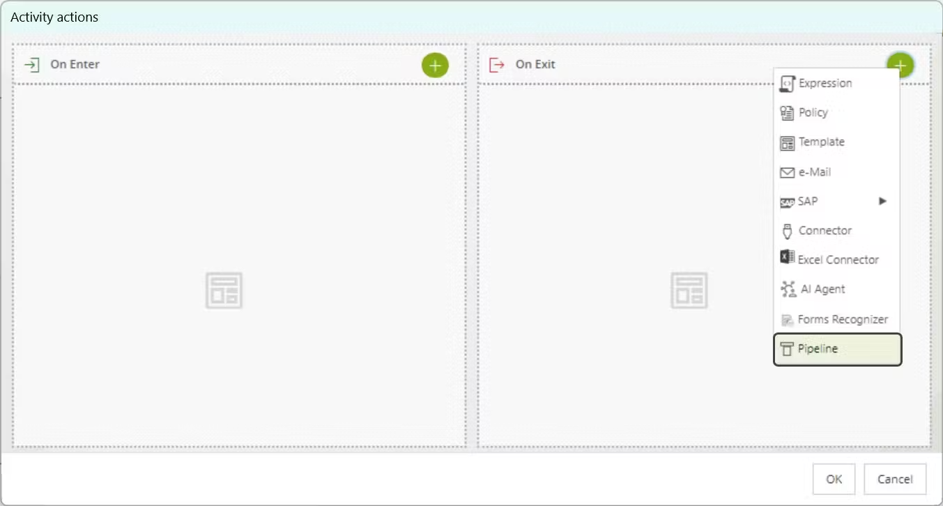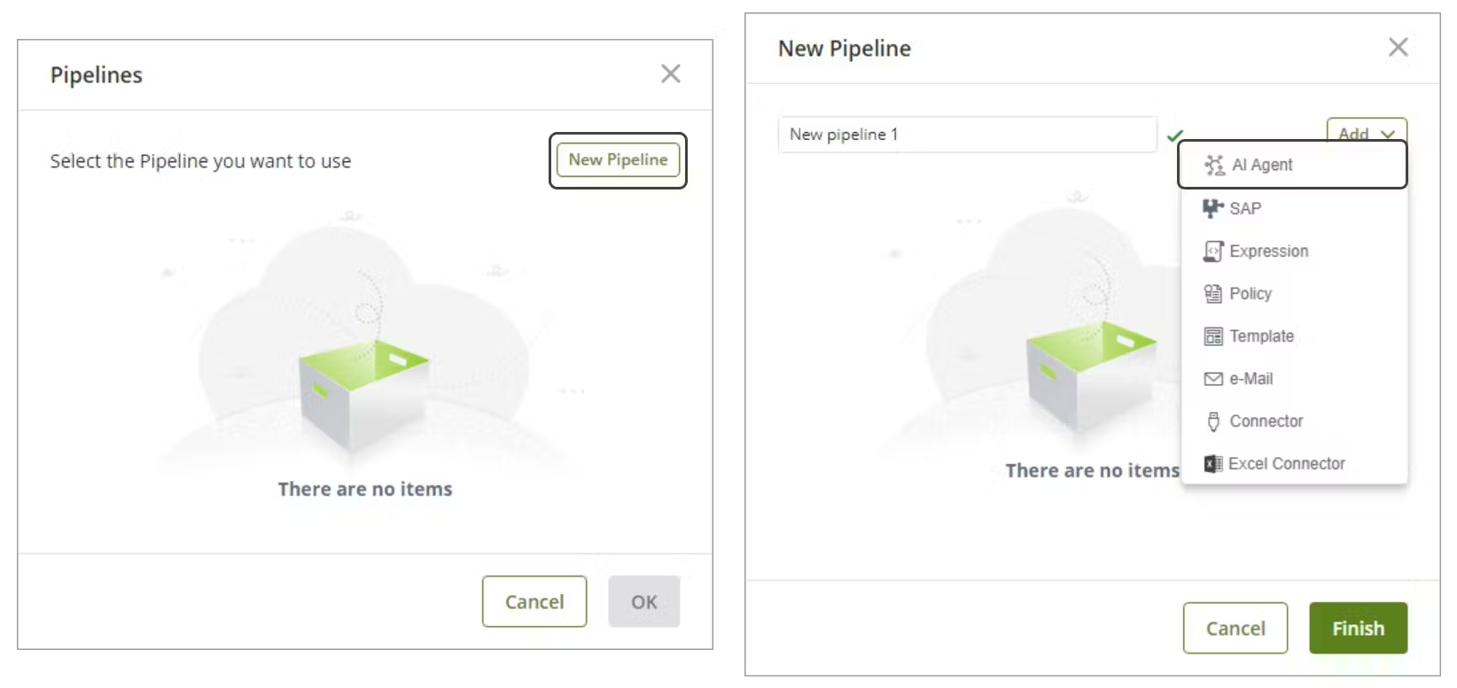 En Bizagi, puede configurar Agentes de IA dentro de Pipelines, lo que le permite integrar IA en cualquier paso del pipeline de manera fluida. Esta mejora le brinda más flexibilidad y potencia en sus pipelines, permitiéndole incorporar tareas impulsadas por IA en sus flujos de trabajo.