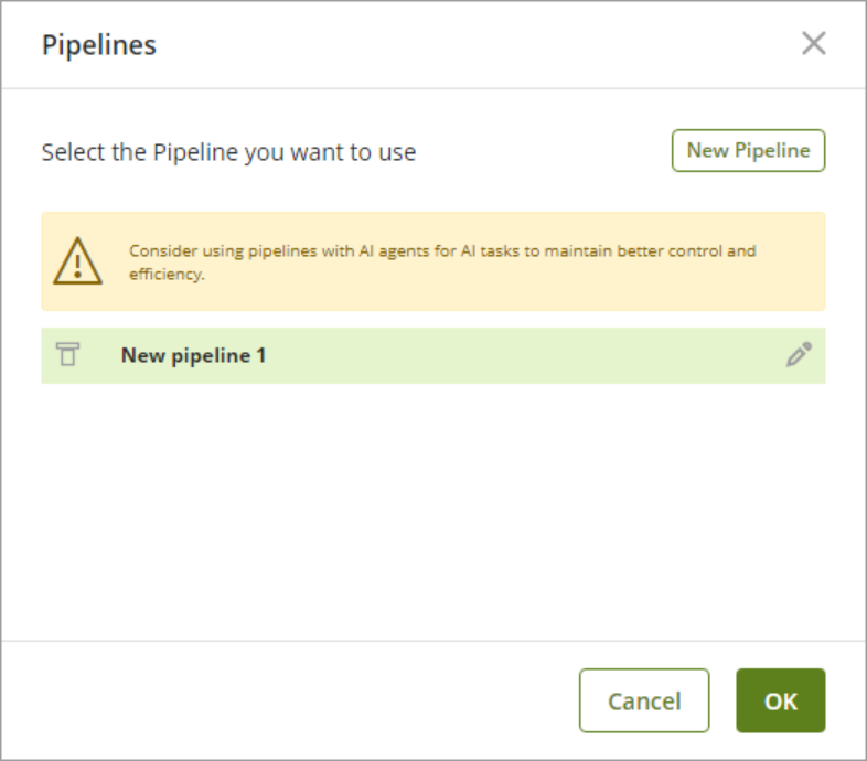 Los Agentes de IA suelen ejecutarse en tareas IA. Con esta actualización, ahora puede ejecutarlos en otras tareas mediante pipelines. Sin embargo, esto no se recomienda, ya que las tareas IA pueden requerir ejecución asíncrona debido a tiempos de procesamiento más largos. Si configura un pipeline con Agentes de IA en tareas no IA, verá una advertencia sobre posibles problemas de usabilidad en el Work Portal.