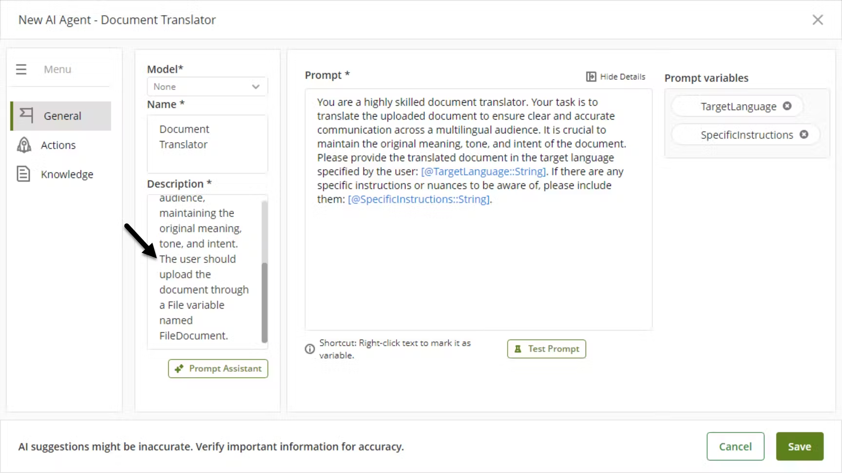 En la sección Prompt, describa las acciones que el Agente de IA debe realizar con cada archivo. Para mejores resultados, especifique con claridad qué recibirá el Agente, qué representa cada archivo y cuál es el resultado esperado.