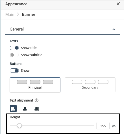Puede ajustar la altura del banner modificando el control deslizante debajo de la etiqueta Altura. El tamaño del banner, en píxeles, se muestra a la derecha del control.
