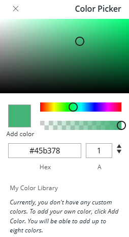 Puede ajustar la opacidad del color seleccionado usando el control deslizante junto al rectángulo. El porcentaje de opacidad se muestra a la derecha del control.