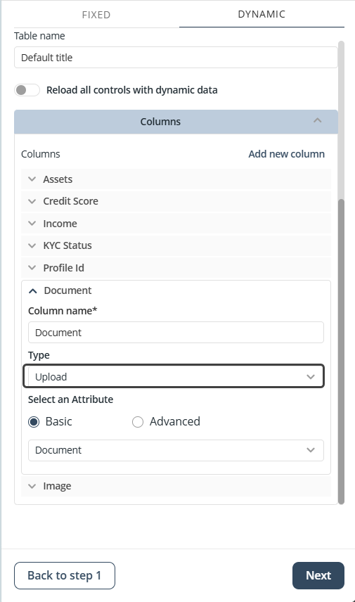 Cuando convierte un control de tipo Colección, los atributos de tipo Archivo se conservan y se mostrarán si son compatibles con el nuevo control. Para configurarlo, seleccione Cargar en el campo Tipo de la columna correspondiente.