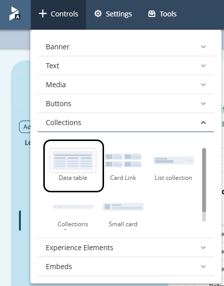 Para agregar el control de Tabla de datos a la página de su app, abra el menú Controles en la parte superior izquierda del editor del App Designer. Expanda la sección Colecciones haciendo clic en el ícono de flecha para ver los controles de Colección disponibles. Luego, desplácese hacia abajo hasta encontrar Tabla de datos y arrastre el control a su página.