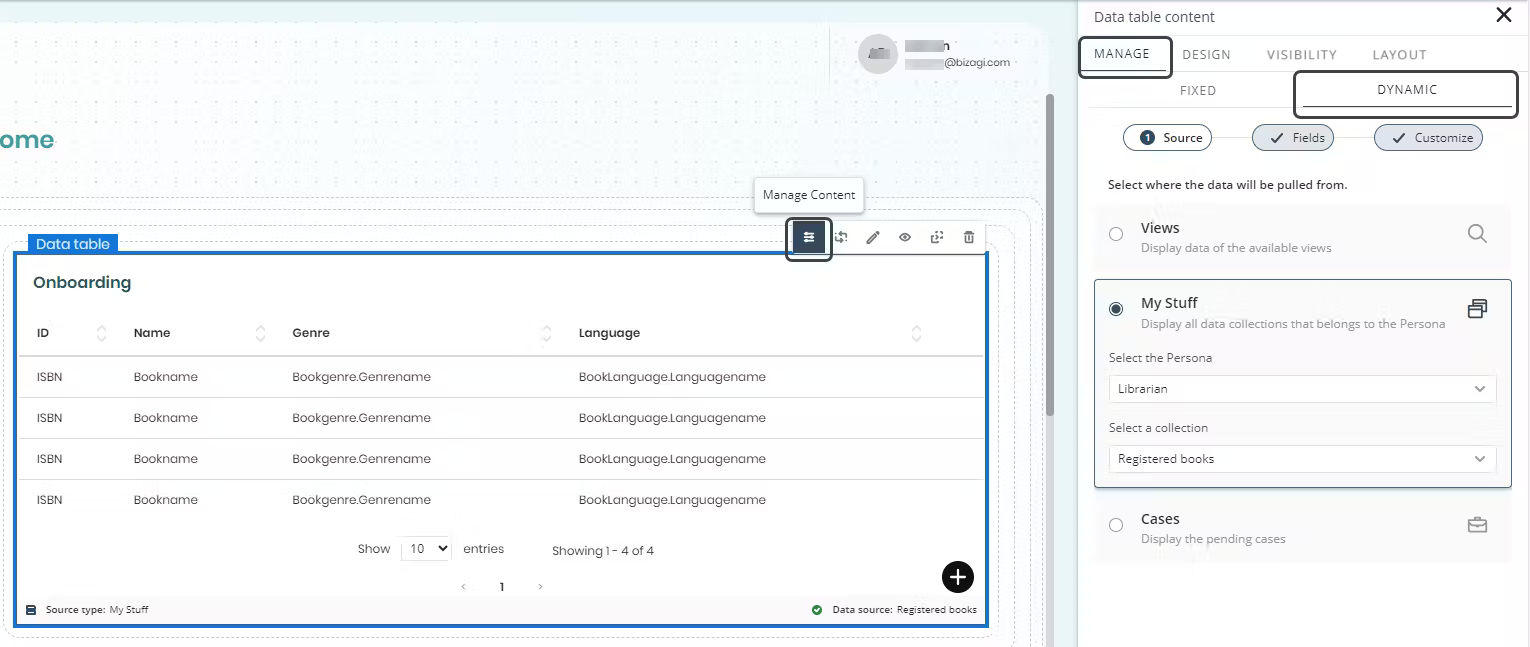 1.Seleccione el control Tabla de datos y haga clic en Administrar Contenido.