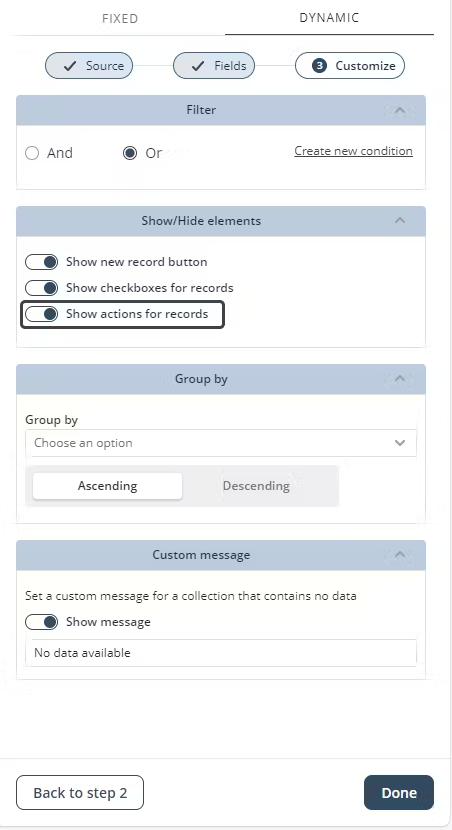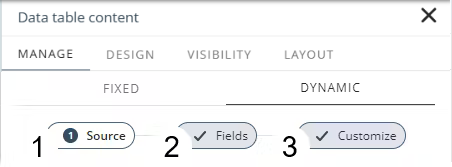 2.En la pestaña Dinámico, complete la configuración de fuentes de datos al realizar los pasos Fuente y Campos.