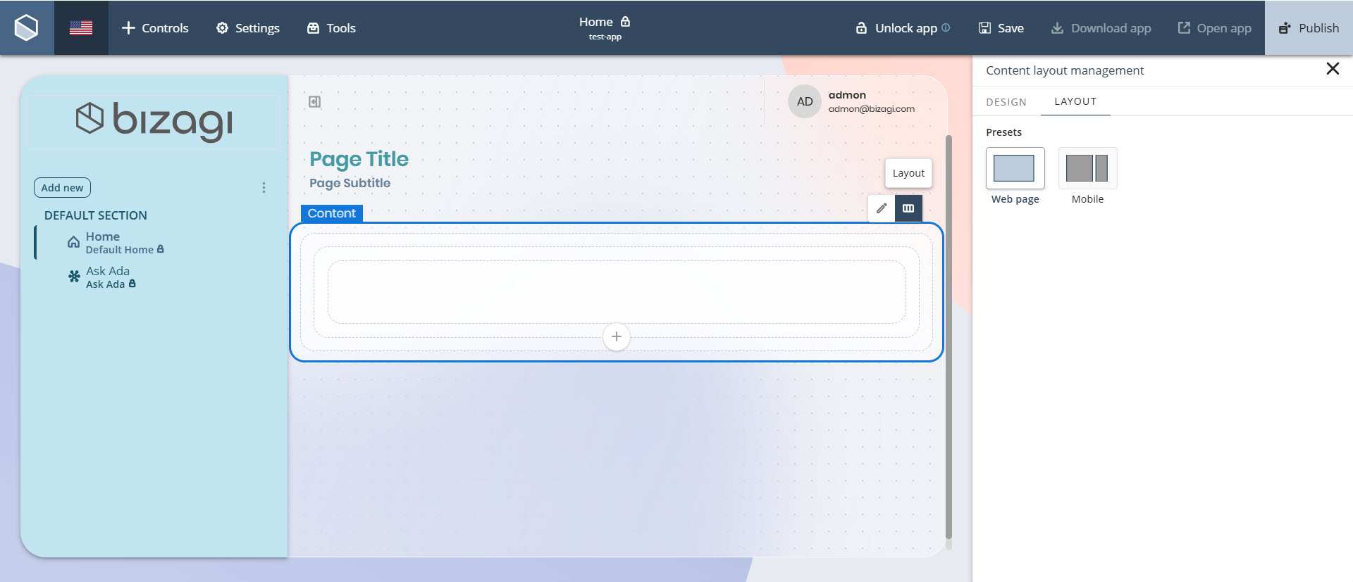 Para configurar su layout, haga clic en la sección Contenido, seleccione la opción Layout y elija un tipo de layout para su app en la etiqueta Preajustes.