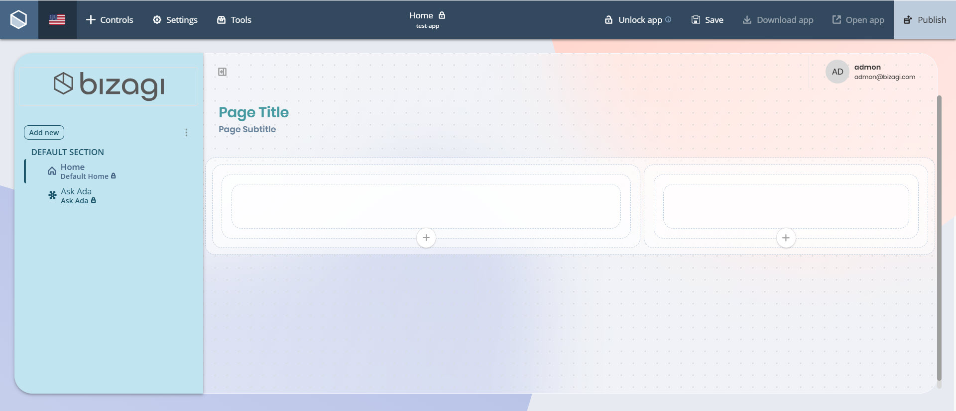 Puede añadir varios contenedores de Contenido para controlar mejor la estructura y la presentación de su app. Los contenedores de Contenido se pueden añadir en cualquier lugar del layout, siempre que estén en el mismo nivel jerárquico. Al seleccionar un contenedor de Contenido existente, aparece un botón Añadir (+) en la parte inferior. Hazga clic en este botón para insertar un nuevo contenedor de Contenido justo después del seleccionado.