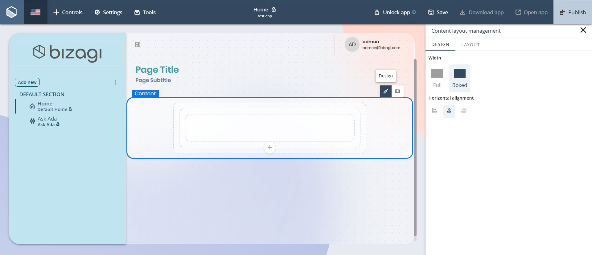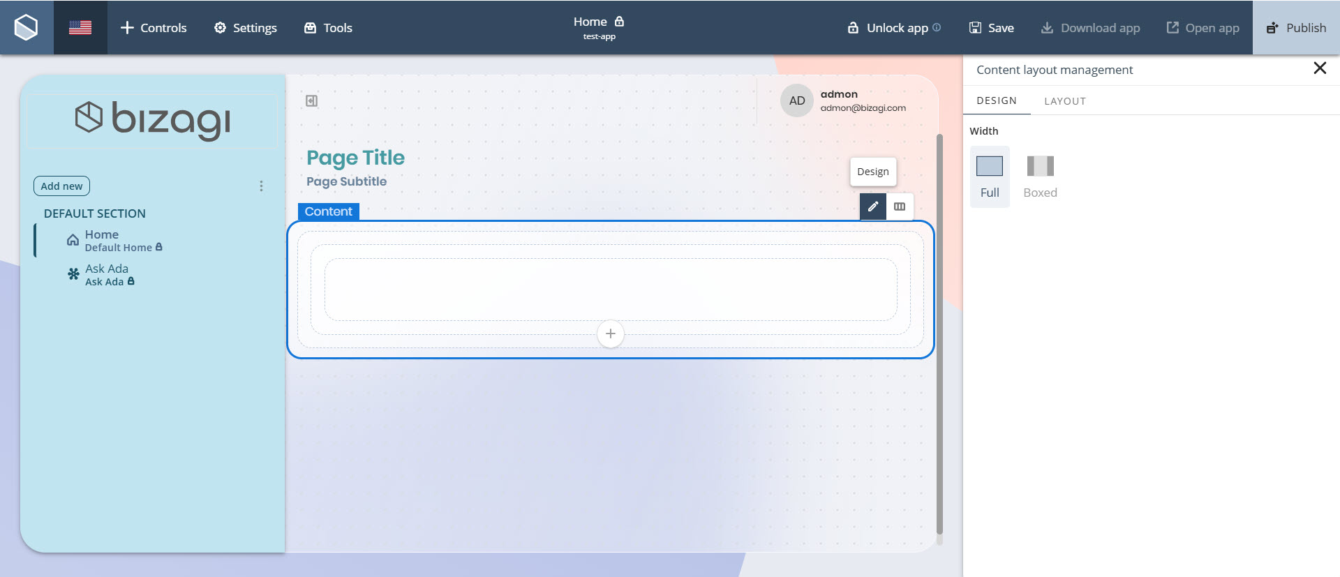 Para hacerlo, haga clic en la sección Contenido, seleccione la opción Diseño y elija el tipo de ancho deseado en la etiqueta Ancho.