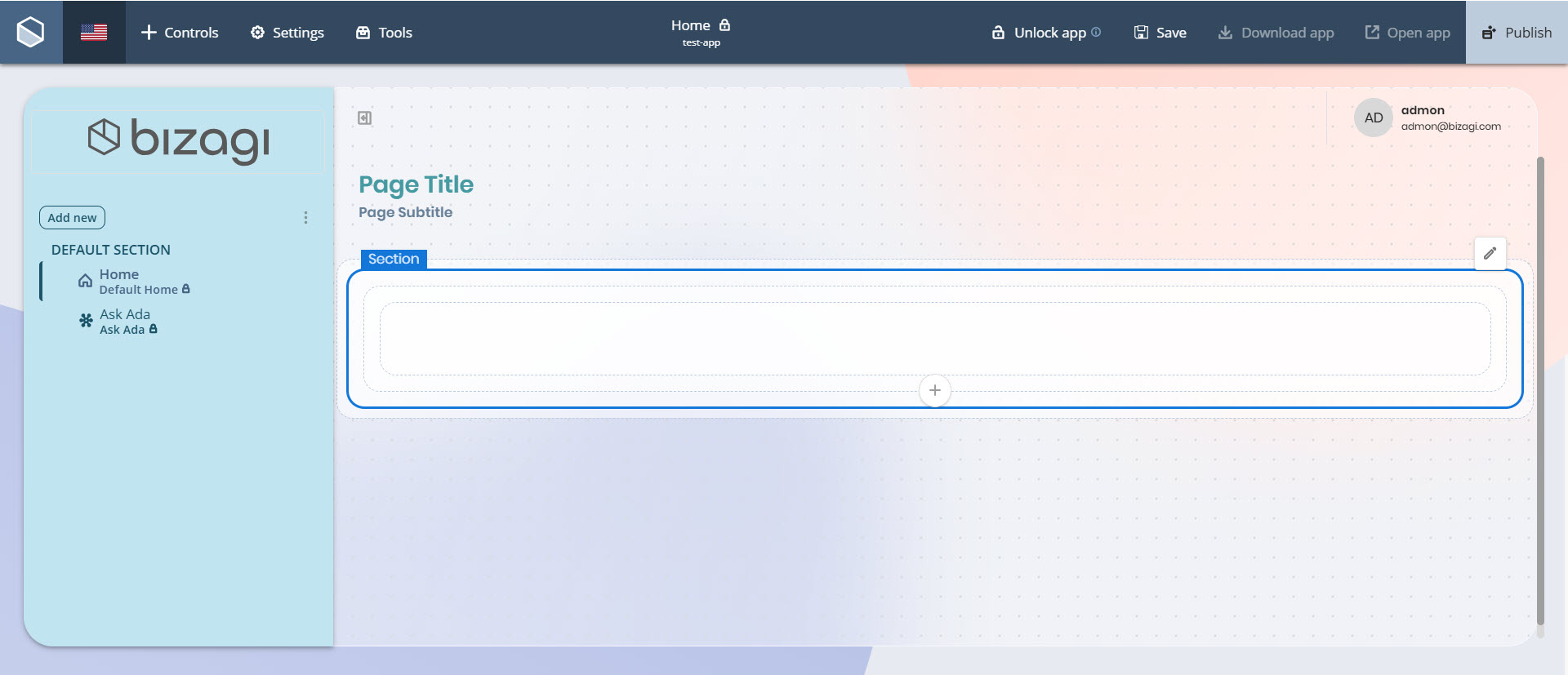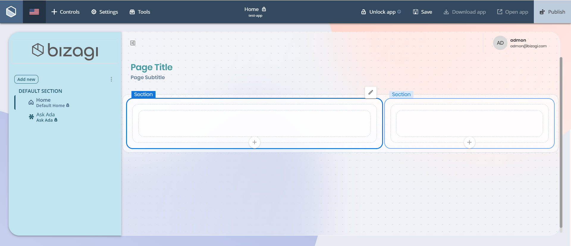 •Escritorio: El contenedor Sección permanece sin dividir y ocupa el 100 % del ancho de la app.