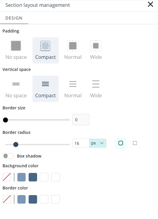 •Color de fondo: Elija un color de fondo para la sección a partir de las opciones predeterminadas disponibles, o utilice la herramienta Selector de color para definir un color personalizado. Para abrir el selector, haga clic en la primera caja de color que aparece debajo de la etiqueta Color de fondo.