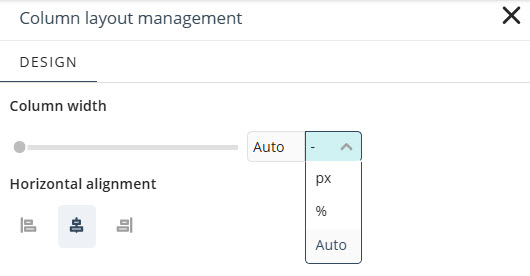 •Ancho de columna: Determina cuánto espacio ocupa una columna dentro de una fila. Puede establecer el ancho utilizando el control deslizante o ingresar un valor específico. Las unidades disponibles incluyen:
