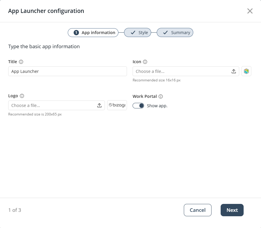 Para modificar el App Launcher, haga clic en Editar App Launcher. Esto abrirá la ventana de configuración, que incluye un proceso de tres pasos: Información de la app, Estilo y Resumen.