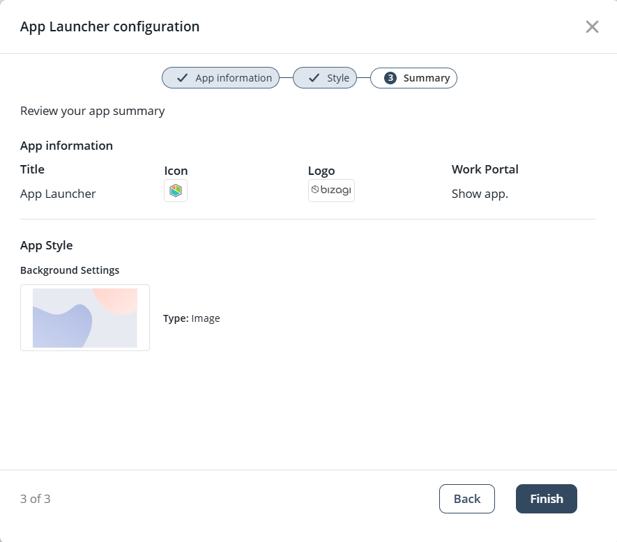 En este paso, usted puede personalizar el fondo del App Launcher seleccionando un color o una imagen y ajustando su estilo a través de las pestañas Configuración de fondo y Personalizaciones, respectivamente.