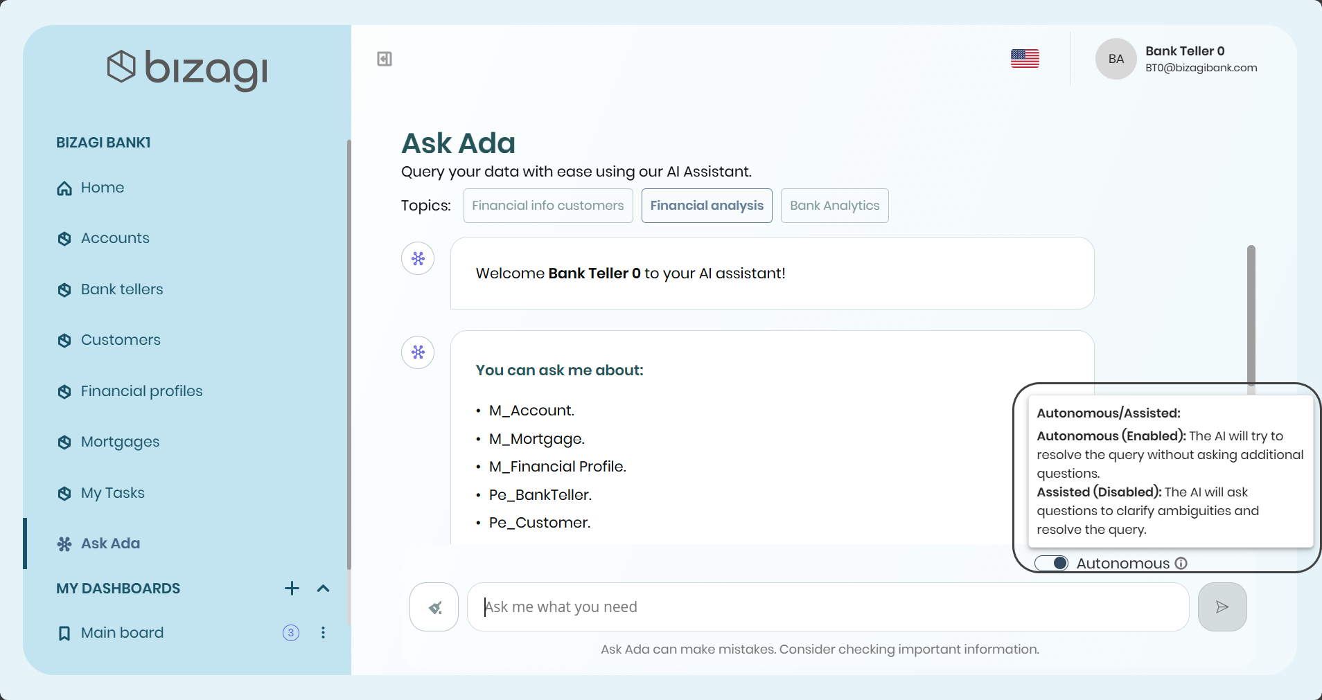 •Modo Autónomo: Este es el modo predeterminado de Ask Ada. La IA resuelve ambigüedades de forma independiente utilizando conocimientos públicos del dominio, solicitando su intervención solo cuando sea necesario.
