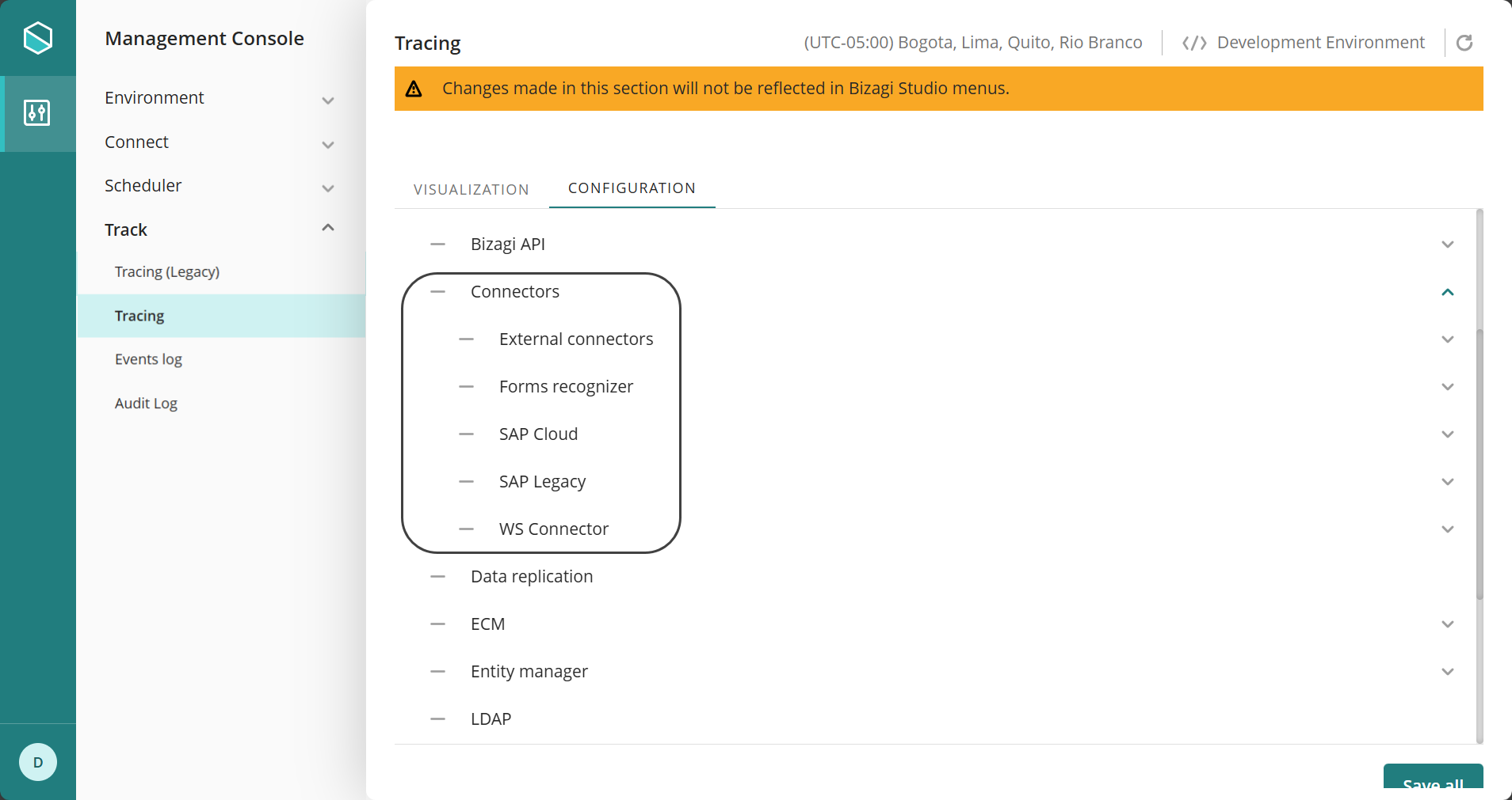En el Management Console: Vaya a la categoría Seguimiento y ábrala para ver más opciones. Haga clic en Rastreo. Busque la pestaña Visualización y en la lista desplegable Categoría, haga clic en Conectores.