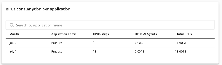 La sección Consumo de BPUs por aplicación muestra el uso detallado de BPUs para el período de tiempo seleccionado. En ella se enumeran todas las aplicaciones que utilizaron BPUs durante ese período. Si el período es menor a un mes, el consumo se muestra diariamente; si es mayor a un mes, el consumo se presenta como un total para cada mes en el rango seleccionado. Al filtrar el consumo de BPU por aplicación, se mostrará una tabla con los datos correspondientes. Según la escala de tiempo que elijas, verás las siguientes tablas: