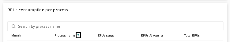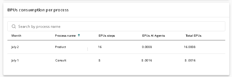 La sección de Consumo de BPU por Proceso ofrece información detallada sobre el uso de BPUs para el período de tiempo seleccionado. En ella se enumeran todos los procesos que utilizaron BPUs durante ese período. Si el período es menor a un mes, el uso se muestra diariamente; si es mayor a un mes, el uso se presenta como un total para cada mes dentro del rango seleccionado.