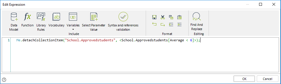 if(<count(School.Approvedstudents[Average < 6])>==1) { Me.detachCollectionItem("School.Approvedstudents", <School.Approvedstudents[Average < 6]> ); } |
