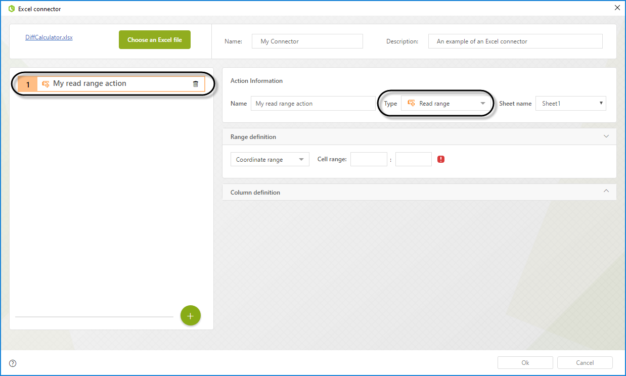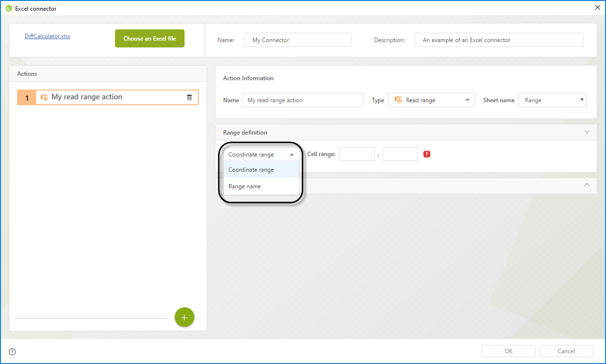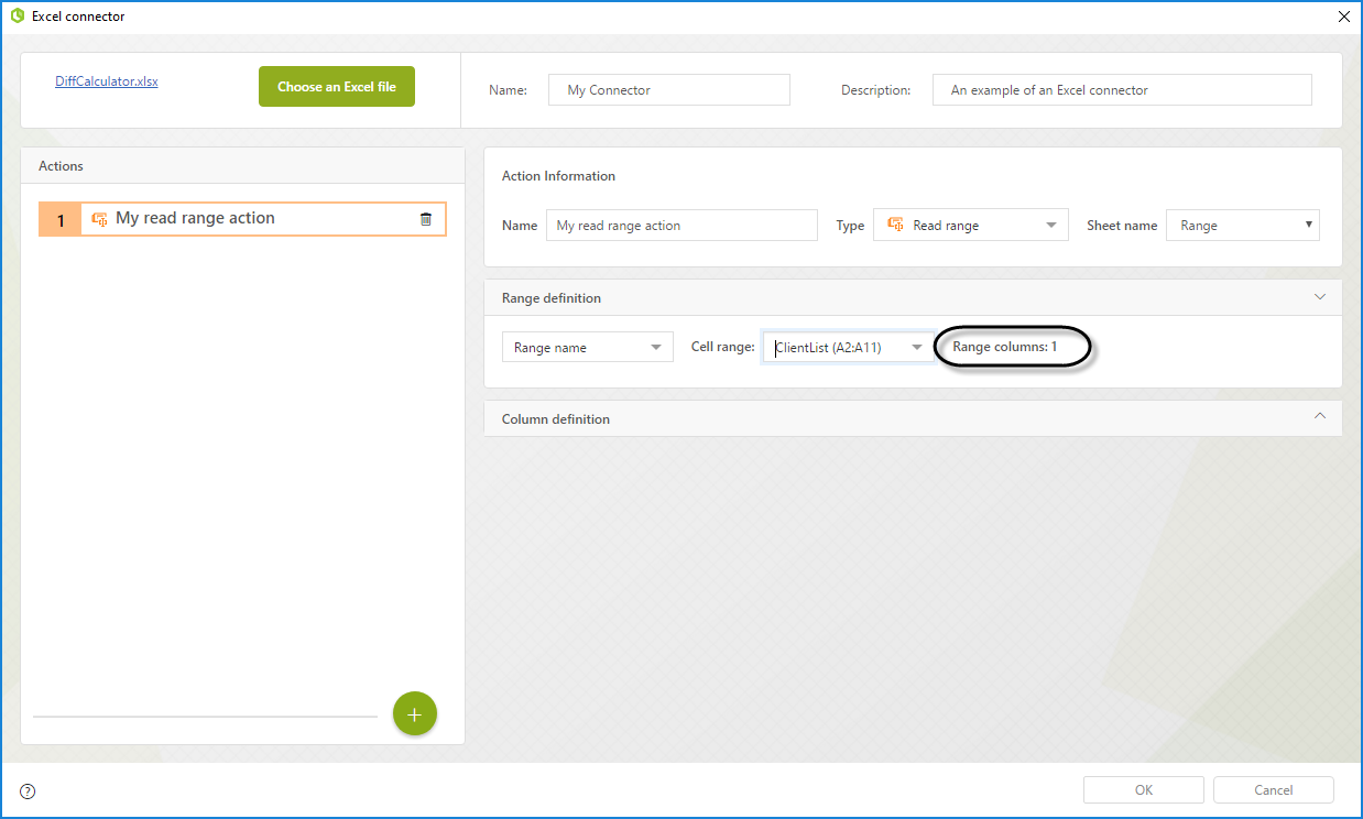 Una Acción leer de un rango puede leer un rango de columnas. Definir una salida para cada columna del rango. Cada columna en el rango está asociada a un atributo de la colección. Para configurar esta acción, debe configurar el rango y la definición de la columna.