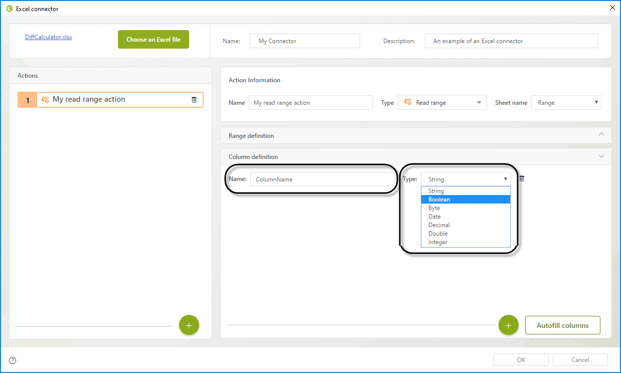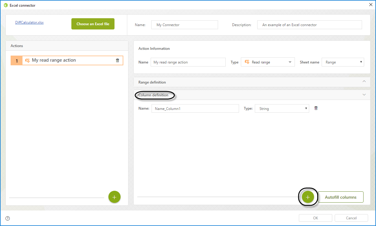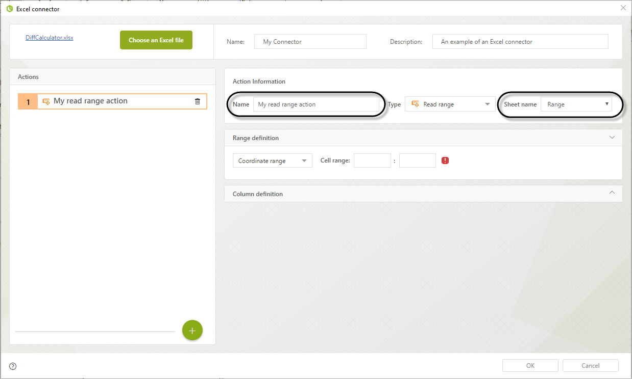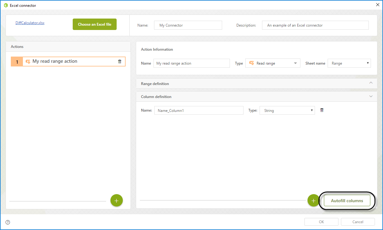 Una Acción leer de un rango puede leer un rango de columnas. Definir una salida para cada columna del rango. Cada columna en el rango está asociada a un atributo de la colección. Para configurar esta acción, debe configurar el rango y la definición de la columna.