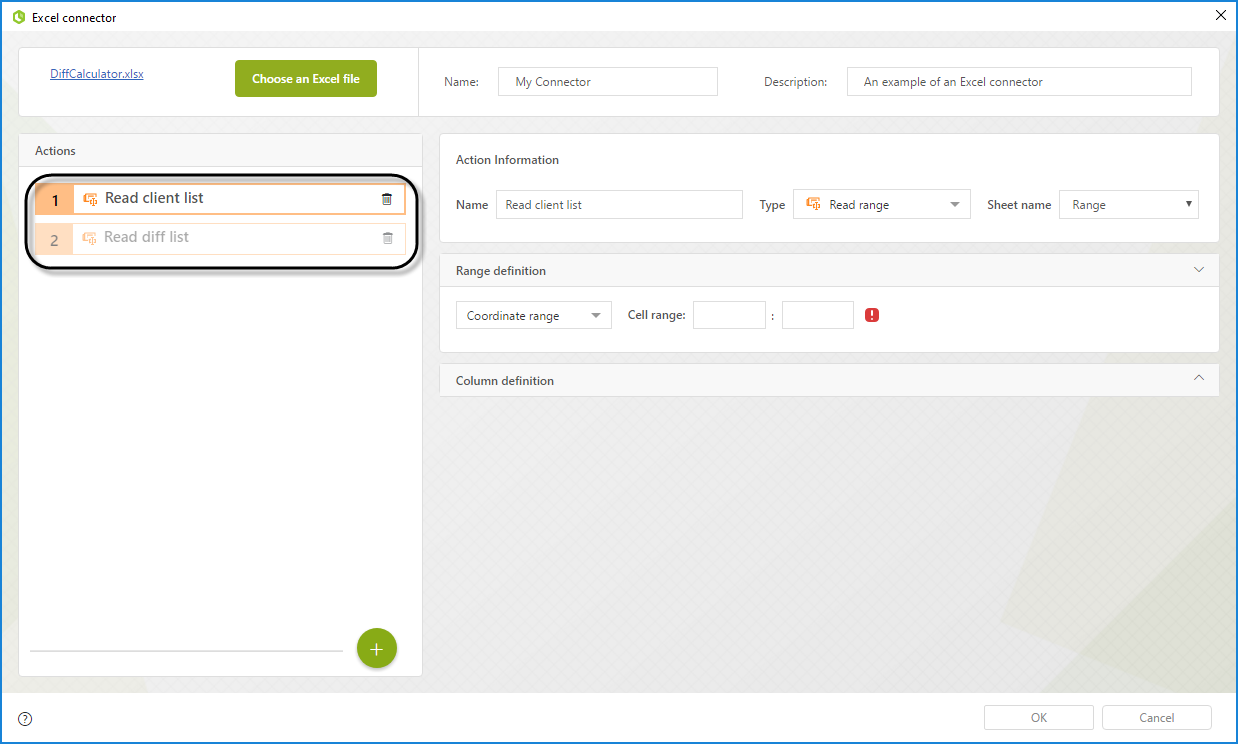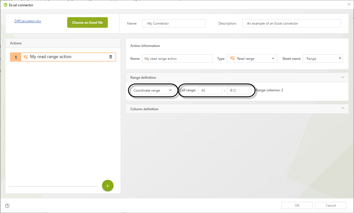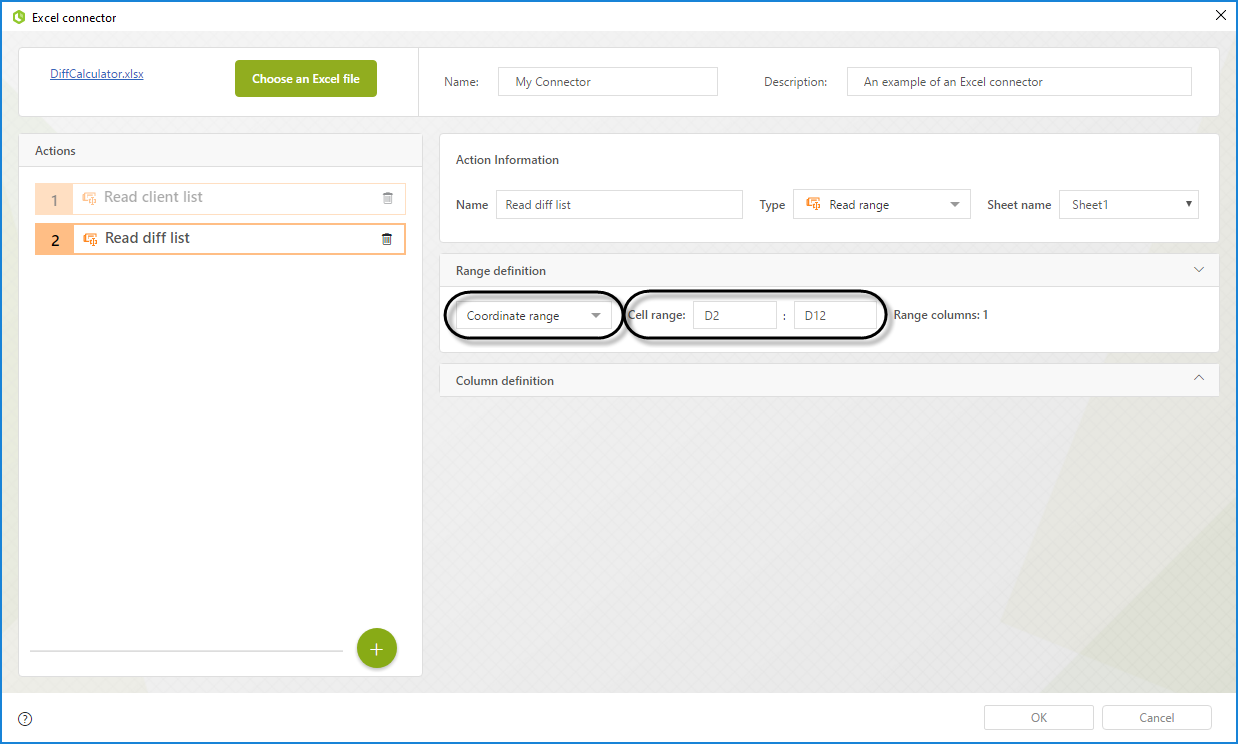 En este ejemplo, el conector leerá la información de los rangos A2: A12 y D2: D12 cuando se ejecute. Dado que los rangos no son adyacentes entre sí, se configuran dos acciones diferentes.