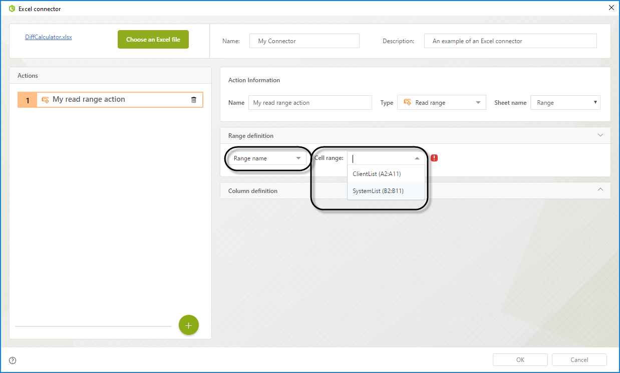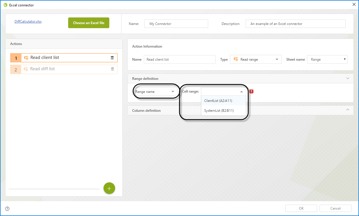 Para la primera acción en la Definición de rango, seleccione Nombre del rango y en la lista desplegable seleccione ClientList(A2:A11).