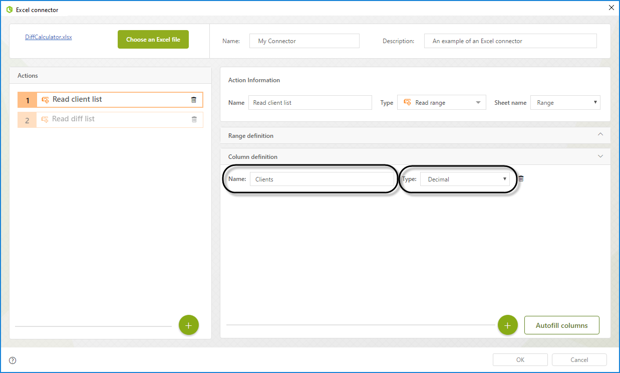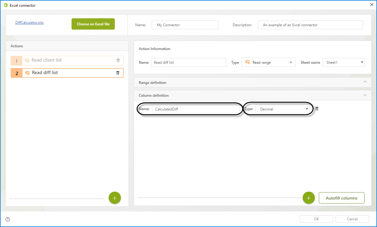 En la Definición de columna, agregue una sola columna y asígnele el nombre CalculatedDiff y asigne Decimal al tipo de dato.