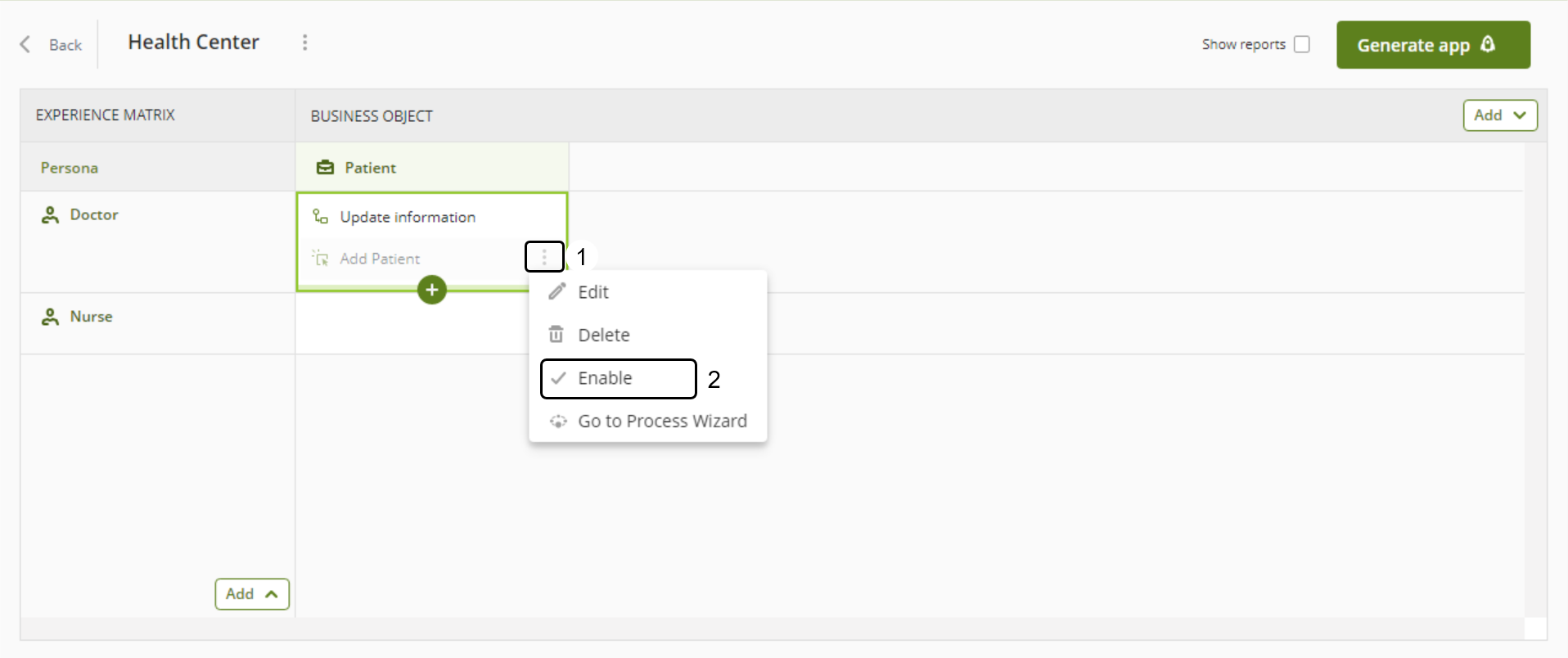 Para mostrar una Interacción de su Matriz de Experiencia a más Personas, y así reutilizar esta Interacción, haga clic en el menú de tres puntos junto a su nombre. Luego, haga clic en la opción Habilitar.