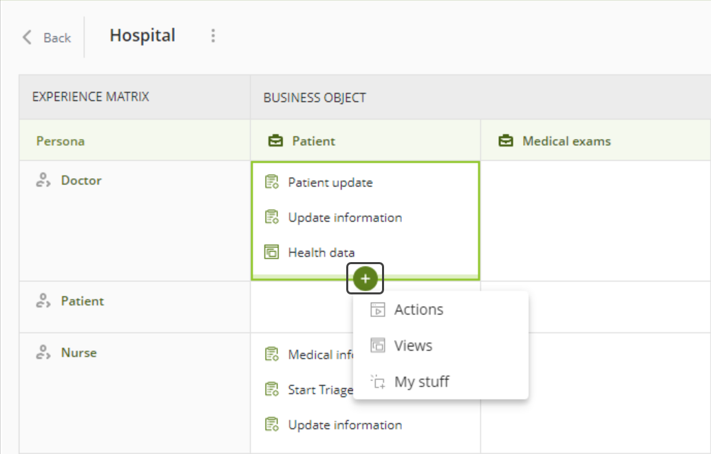 Para agregar cualquiera de estos tipos de Interacciones, coloque el cursor sobre la intersección Persona - Objeto de Negocio y haga clic en el ícono