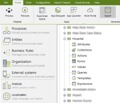 Las entidades Paramétricas pueden ser modificadas en la vista de Experto utilizando las opciones mencionadas más adelante. Tenga en cuenta que estas entidades pueden ser creadas y configuradas desde cualquier modelo de datos o desde esta vista. Para conocer más sobre entidades Paramétricas siga este enlace. Algunas opciones se muestran al hacer clic sobre una entidad, otras se muestran seleccionando uno de los nodos de la misma.