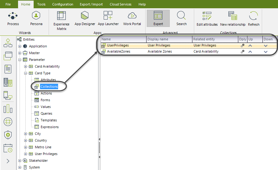 El nodo de Colecciones contiene las relaciones uno a muchos de la entidad. Cada colección tiene un nombre, un nombre visual (el cual se utiliza en el portal de trabajo) y la entidad relacionada.