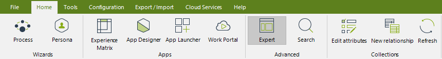 Cuando se selecciona el nodo Atributos o Colecciones, la cinta de opciones muestra lo siguiente: