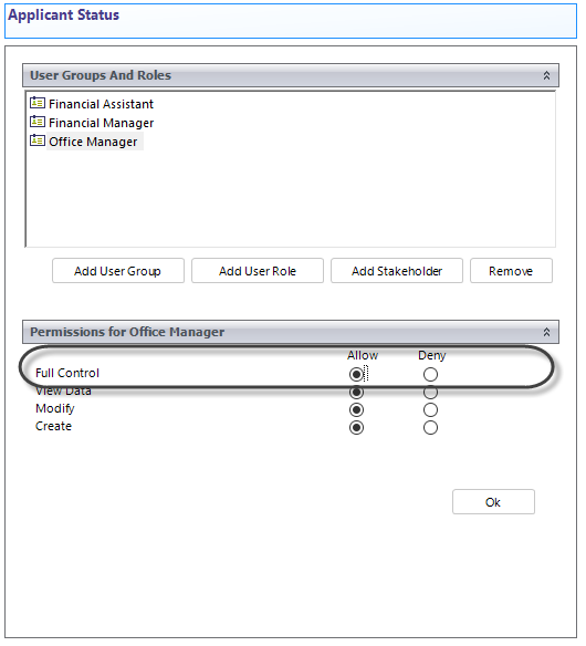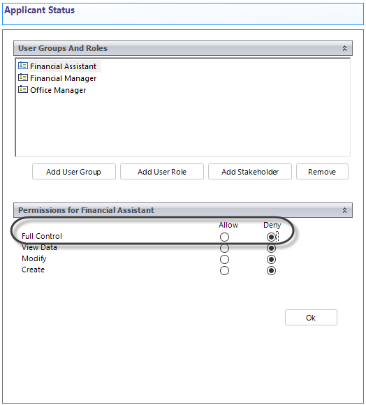 Para el Rol Análisis (Analysis) seleccione la opción Denegar en la opción Control Total. Esto restringirá a los a los usuarios con Rol Análisis (Analysis) el acceso a la entidad. Observe que las demás opciones se deshabilitarán.