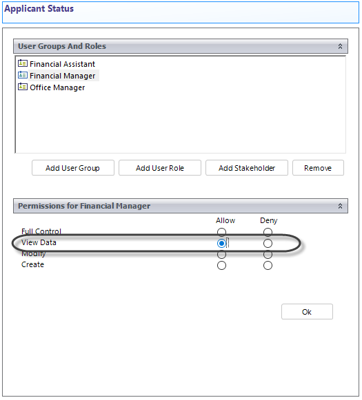 5. Al grupo se le concederán permisos para Ver Datos, Exportar y Analizar la Consulta. Dé clic en el grupo y seleccione Permitir en todas las opciones disponibles. Finalmente dé clic en OK.