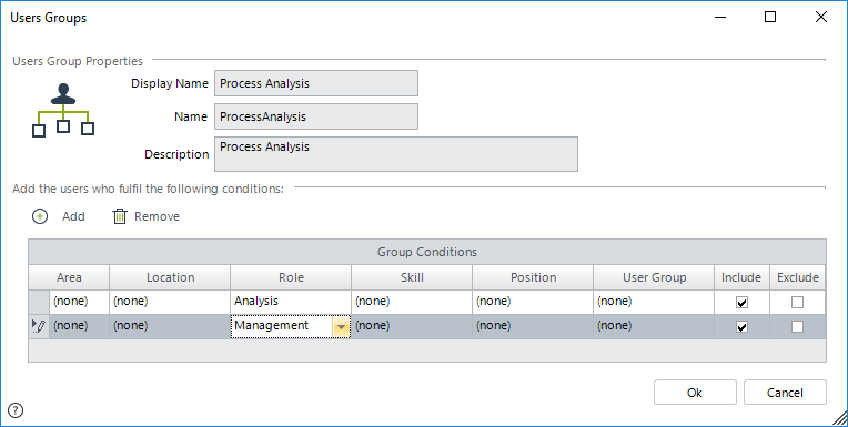 Debido a que las consultas se utilizan para buscar casos que cumplan con criterios definidos y realizar análisis, solo las personas encargadas del análisis del desempeño de los Procesos deberían poder acceder a ellas. Creamos el grupo de Usuarios Grupo de Análisis de Procesos (Process Analysis group) donde incluimos los Roles de Análisis (Analysis) y Gestión (Management).