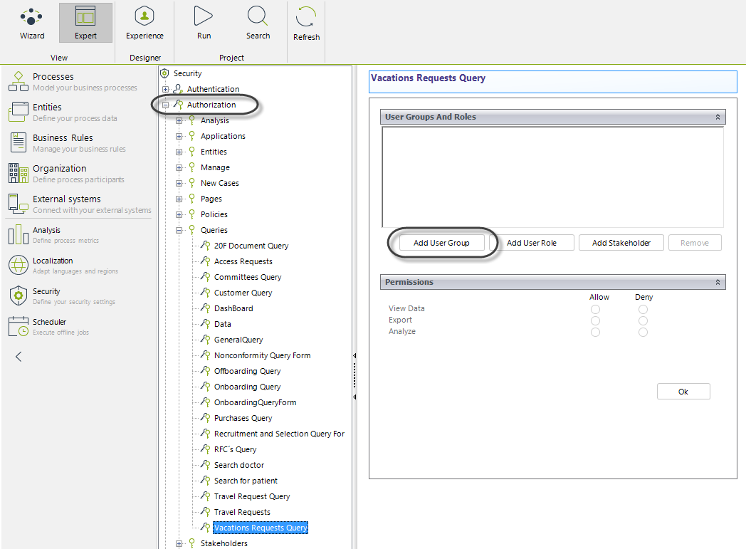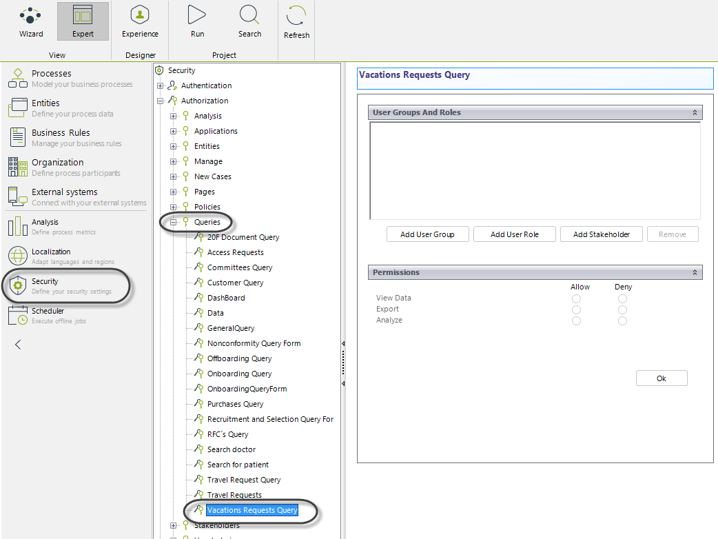 2. Expanda las opciones de Autorización. Luego vaya a la opción Consultas y seleccione la consulta a la cual se configurarán los permisos de acceso. Para este caso, la consulta es Consulta de Vacaciones (Vacations Query).