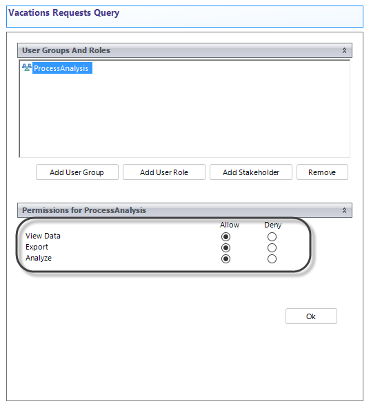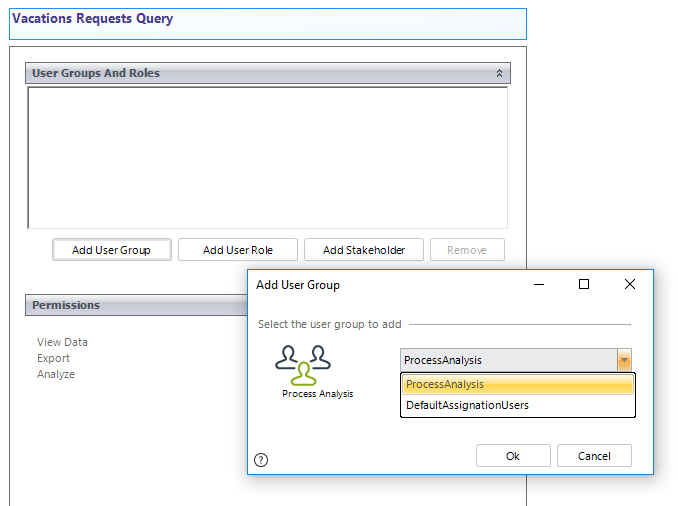 4. Incluya los Grupos de Usuario para los cuales configurará los permisos de acceso a la Consulta. En este caso incluya el Grupo de Análisis de Procesos (Process Analysis Group).