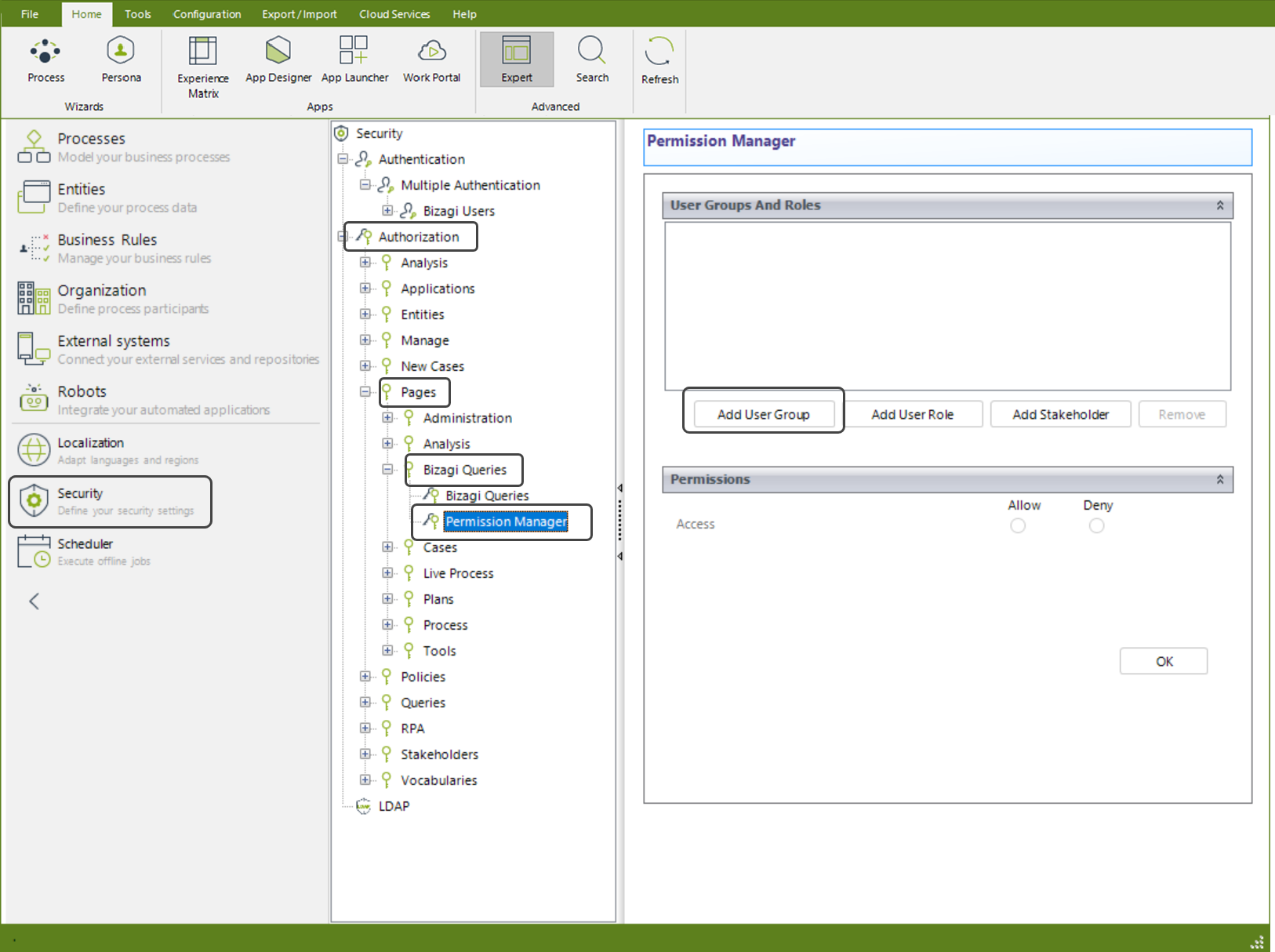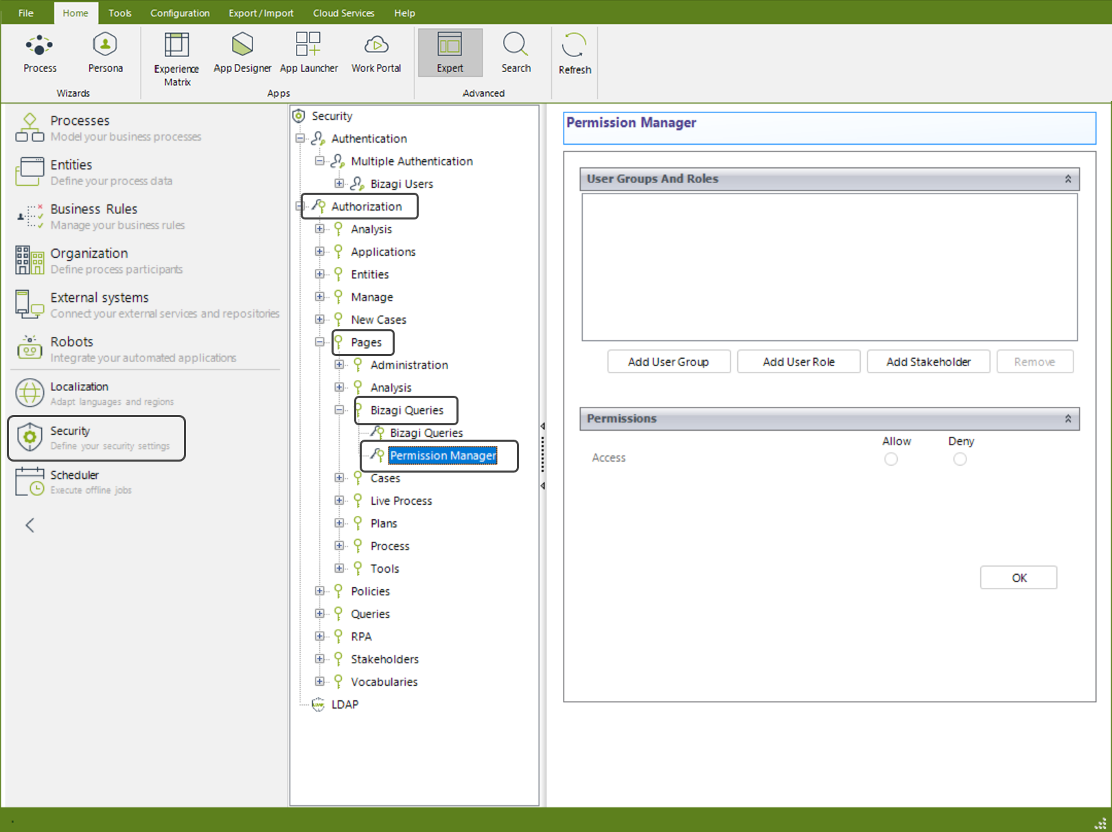 1. Vaya al modulo de Seguridad en la Vista de Experto.