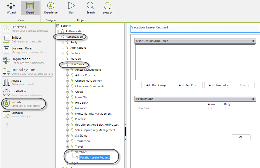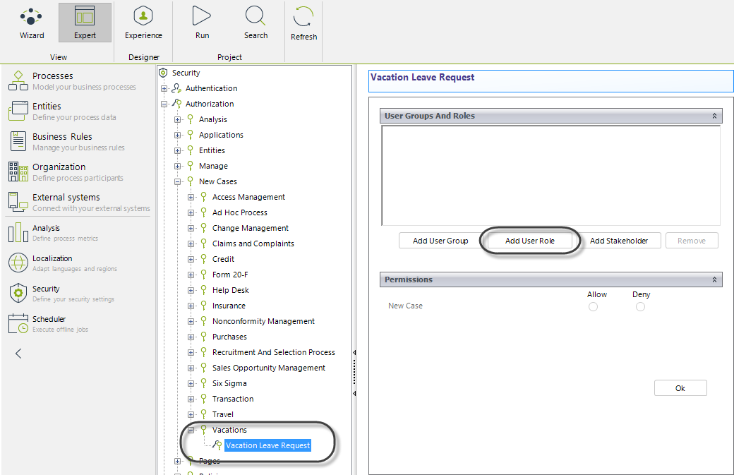 2. Expanda la opción Autorización. Luego diríjase a Nuevos casos, seleccione la aplicación y el Proceso donde se configurarán los permisos de acceso. Para este caso, la aplicación es Solicitud de Vacaciones (Vacation Request) y el Proceso es Solicitud de Licencia de Vacaciones (Vacation Leave Request).
