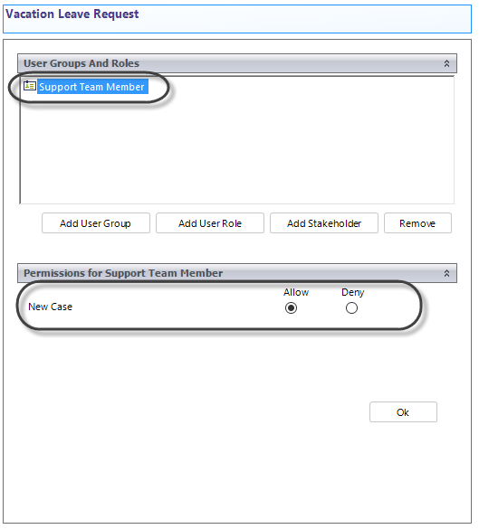 5. Como el Rol seleccionado debería estar habilitado para la creación de casos, dé clic en el Rol y seleccione la opción Permitir para Nuevo Caso.