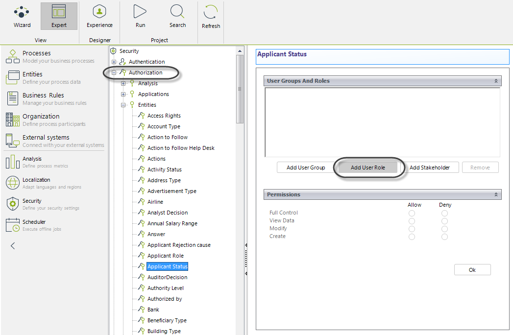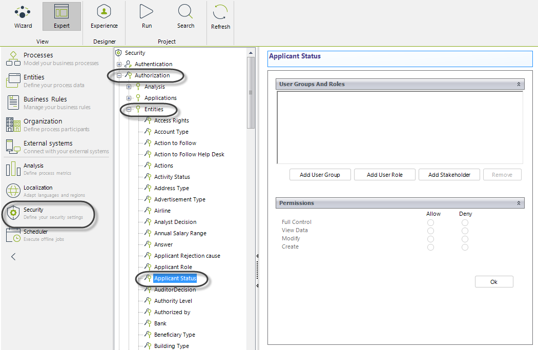 2. Expanda las opciones de Autorización. Luego vaya a la opción Entidades, seleccione la entidad a la cual se configurarán los permisos de acceso. Para este caso, la entidad es Estatus del Aplicante (Applicant Status).