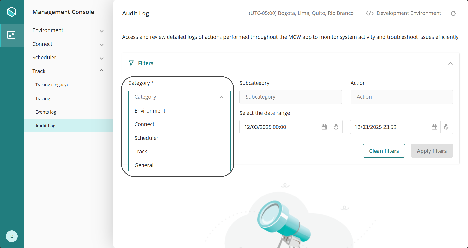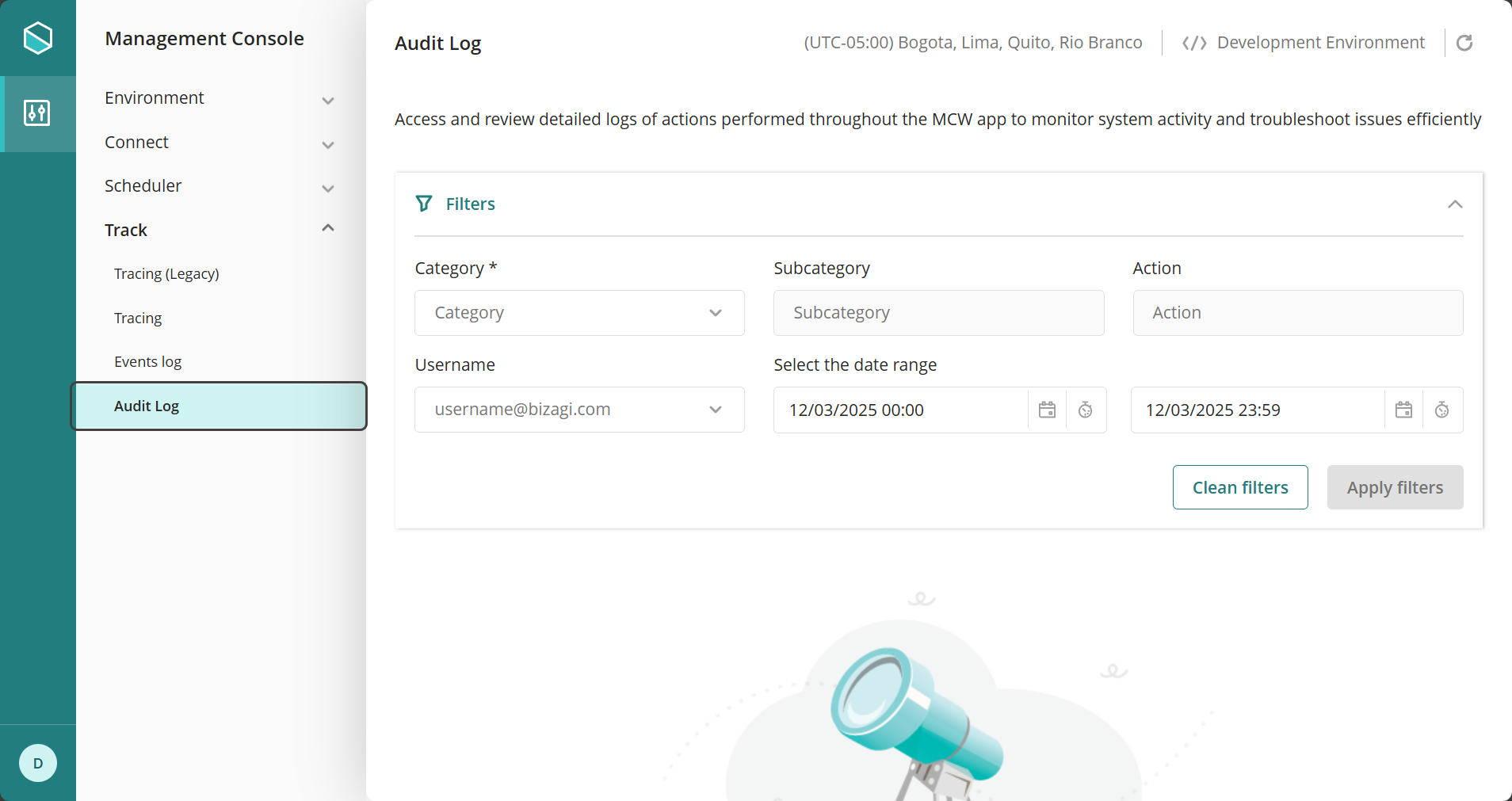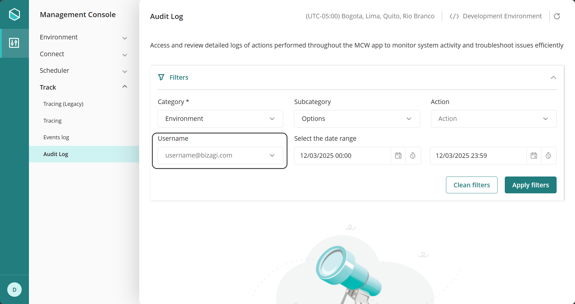 En la Management Console, bajo la pestaña Seguimiento, la opción llamada Log de Auditoría proporciona un conjunto de filtros que le ayudarán a encontrar de manera eficiente la información que necesita.