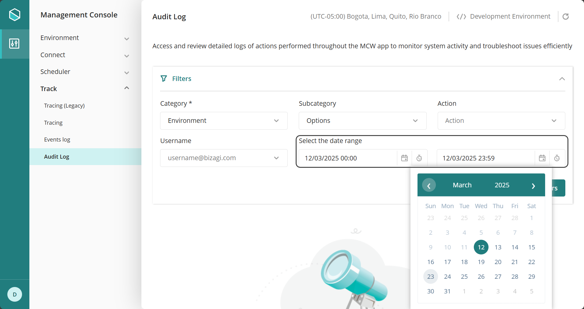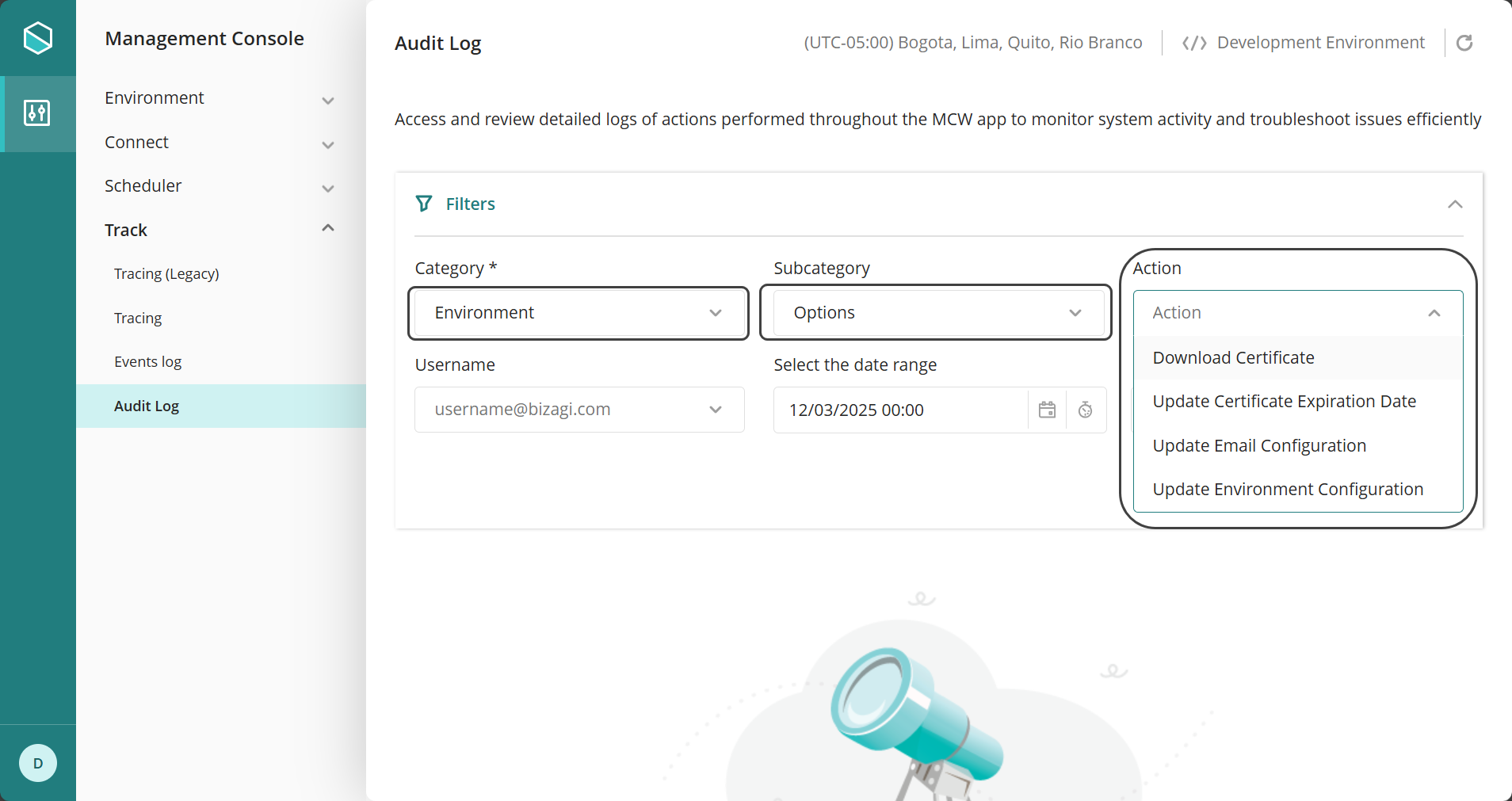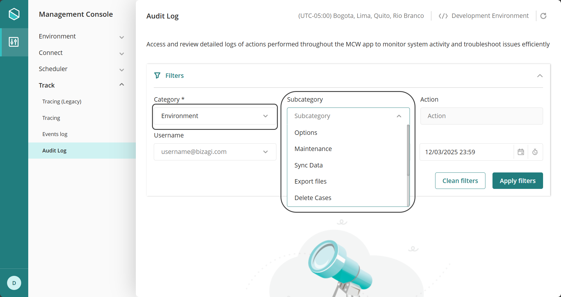En la Management Console, bajo la pestaña Seguimiento, la opción llamada Log de Auditoría proporciona un conjunto de filtros que le ayudarán a encontrar de manera eficiente la información que necesita.