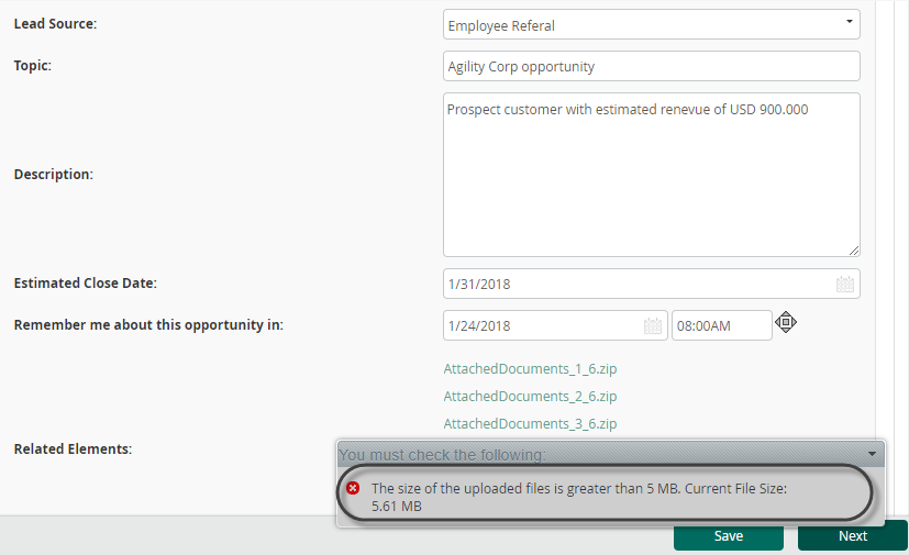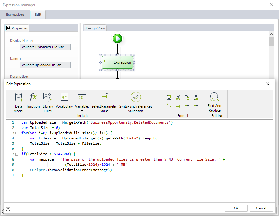 La siguiente expresión muestra cómo se obtiene el total del tamaño de los archivos almacenados en el atributo de tipo archivo llamado RelatedDocuments (desde la entidad Business Opportunity). El tamaño obtenido no debe ser mayor a 5 MB (5.242.880 bytes). Si el tamaño excede este valor, se muestra un mensaje al usuario a través de un mensaje de validación utilizando CHelper.ThrowValidationError. Esta expresión es ejecutada cuando se haga clic en Siguiente en la forma de una tarea.