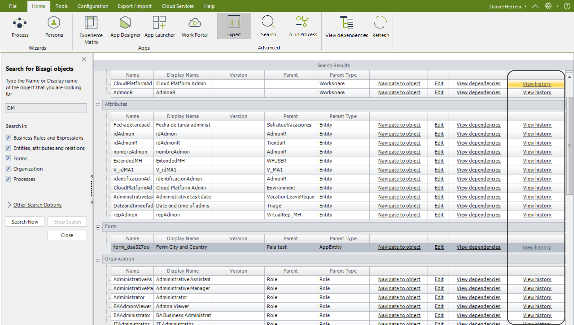 Cuando los resultados son mostrados, estos se listan de acuerdo con el tipo del objeto. Cuando los objetos tienen versiones, el número de la versión es mostrado también. También se muestra su proceso padre y el tipo. Los desarrolladores pueden navegar directamente al objeto al hacer clic en el botón Navegar al objeto. Puede abrirlo para su edición al hacer clic en las opciones de Editar o ver sus dependencias.