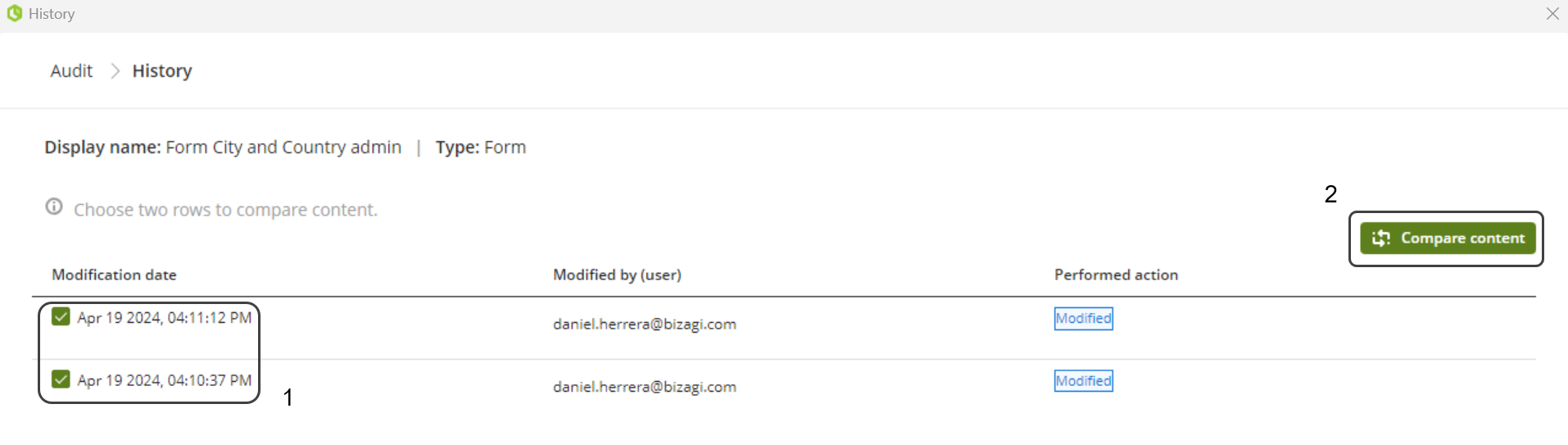 Para realizar una auditoría de objetos en Studio, vaya a la Vista de Experto y diríjase a la sección de Búsqueda de Objetos de Bizagi. Haga clic en el hipervínculo que dice Ver Historial. Seleccione los registros que le interesen y luego haga clic en el botón Comparar contenido.