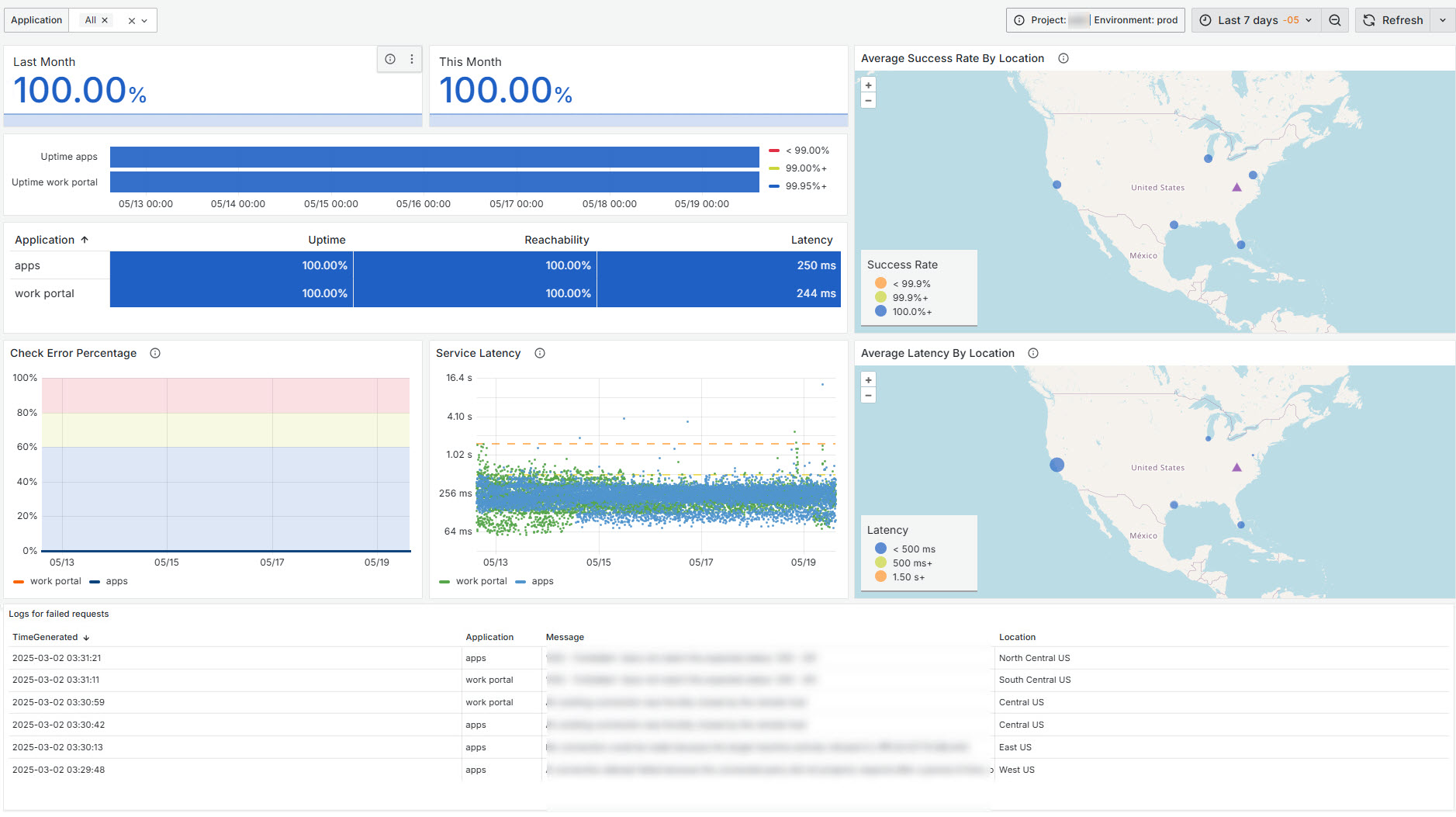 Utiliza un gráfico de dispersión para visualizar la latencia a lo largo del tiempo. Cada minuto, el sistema llama a un endpoint de verificación de salud para el Portal de Trabajo y Apps, que son los servicios orientados al cliente que mejor reflejan el tiempo de respuesta percibido.