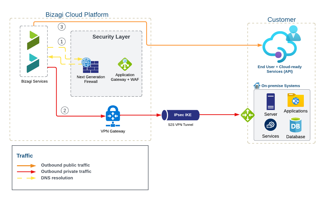 El acceso se enruta a través de la Internet pública a través de HTTPS, que ya se encarga de cifrar los datos en tránsito. Las conexiones entrantes pasan a través de la capa de seguridad, que es una medida de seguridad sólida para sus entornos de automatización. Sin embargo, la VPN no está destinada a restringir el acceso a sus entornos. Puede solicitar una configuración de lista blanca, por lo que las direcciones IP se pueden incluir en la lista como las únicas permitidas para acceder a cualquiera de los portales basados en la nube de Bizagi y brindar seguridad adicional.