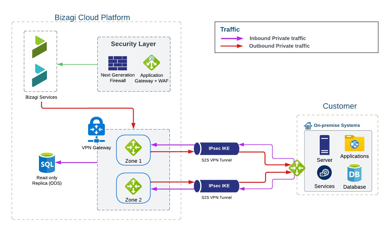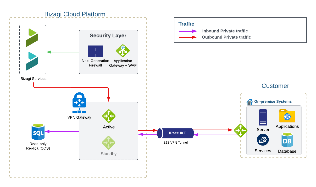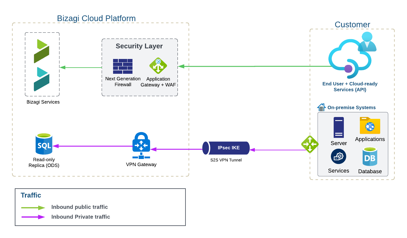 Por defecto, el tráfico entrante a los entornos de Bizagi Cloud se enruta a través de Internet, lo cual es el enfoque recomendado por su simplicidad, rendimiento y facilidad de gestión. Esta configuración permite un acceso eficiente a dispositivos y servicios para usuarios y clientes, mientras asegura que el único tráfico entrante permitido es para acceder al servidor ODS.